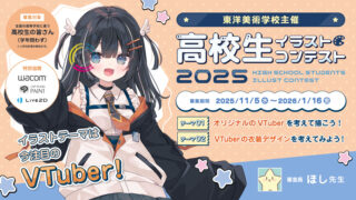TOPICS 東洋美術学校主催【高校生イラストコンテスト2025】を開催します!テーマは今注目の「VTuber」〜11/5(水)より募集開始〜 この度、全国の高等学校に通う高校生の皆さん(学年問わず)を対象にした「高校生イラストコンテスト2025」を開催します! 描くことが好きな気持ちを、そのまま作品に込めてください。たくさんのご応募をお待ちしております! イラストテ... 2025.10.23 TOPICS最新情報