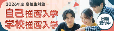 ※【AO入学・AO特待生入学・特待生入学・学校推薦入学・自己推薦入学・指定校推薦入学・一般入学・編入学】の各入学方法について、詳細は「入試区分」ページにてご確認いただけます。