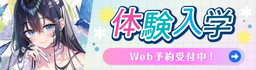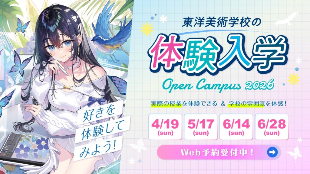 デザイン・イラスト・3DCG・映像・漫画・アートなど、気になる分野を体験できる「体験入学」を開催!学校のリアルな授業や雰囲気を感じながら、自分の“好き”を発見できるチャンス。体験を通して自分にぴったりの将来の仕事を見つけてみませんか?