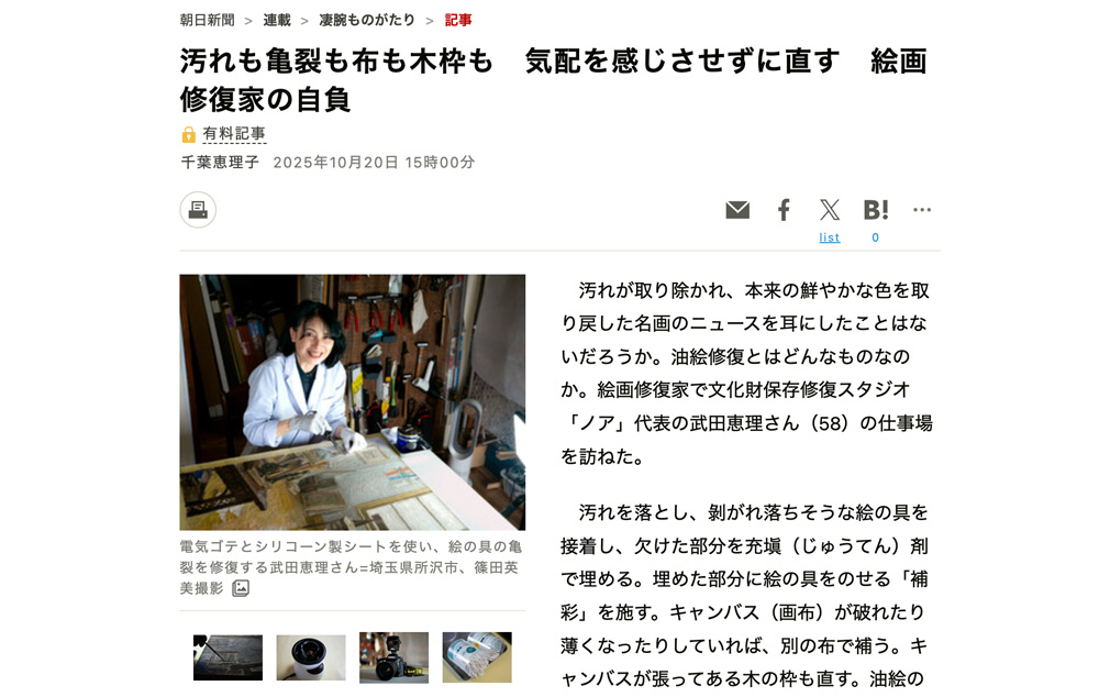 【講師の活躍】保存修復科外来講師(油彩画修復)の武田恵理先生のインタビュー記事が朝日新聞に掲載されました。