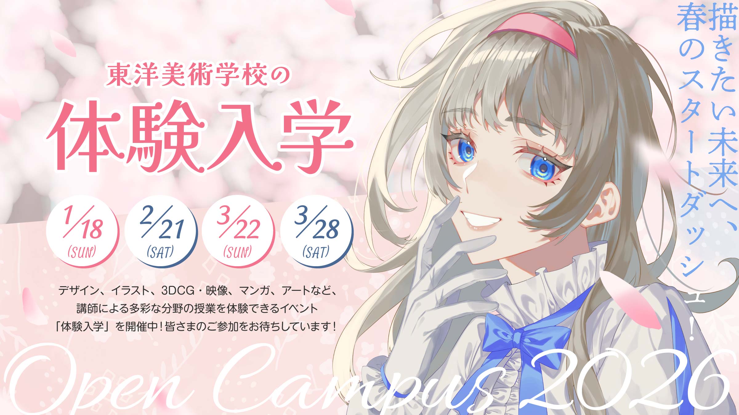 東洋美術学校では、進路を検討されている皆様に向けて、体験入学を毎月実施しています。3月28日(土)のほか、2月21日(土)、3月22日(日)の日程で予約を受付中です。