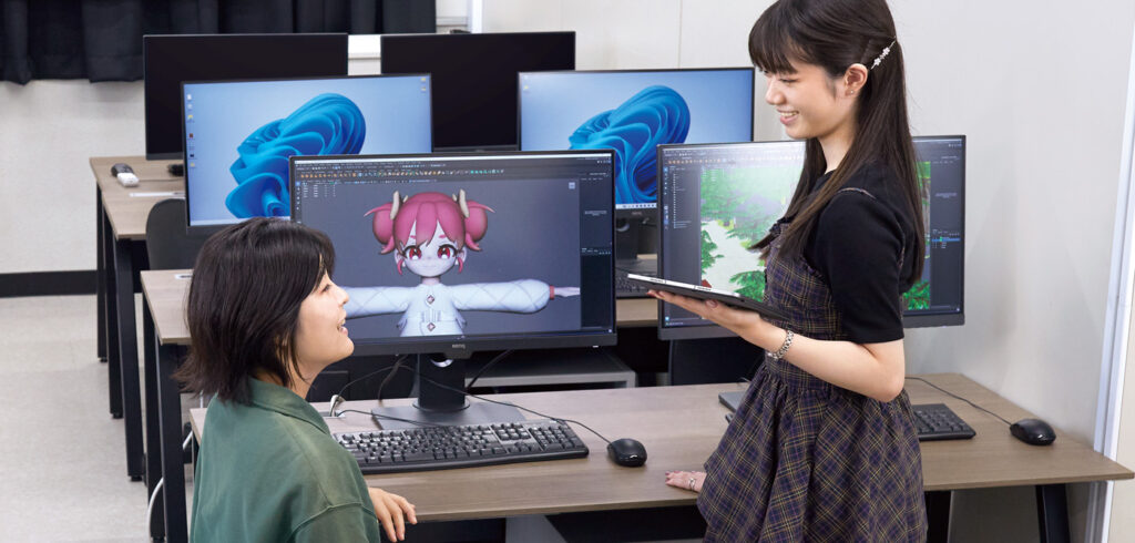 高度グラフィックアート専攻では、ゲーム・映像業界で求められる3DCG制作技術を基礎から学びます。3Dモデラー、3Dアニメーター、映像クリエイター、コンポジターなど幅広い職種を目指し、エンターテインメント分野で活躍できるCGスペシャリストを育成します。